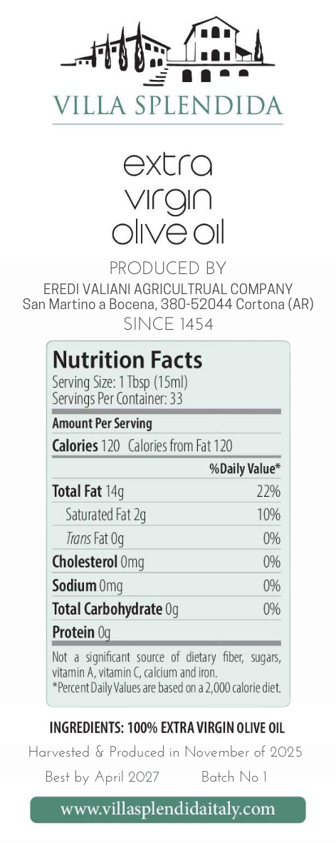 From the sun-drenched groves on our property in the Tuscan region comes a liquid gold that embodies the essence of Tuscan terroir and centuries-old expertise. With its vibrant green hue and intoxicating aroma, this olive oil promises to transport you to the picturesque landscapes of Tuscany with every drizzle. This liquid gem is the result of meticulous craftsmanship, where olives are handpicked solely from Villa Splendida's olive groves at the peak of ripeness and pressed with utmost care to preserve their natural goodness. The oil is mechanically cold pressed from a mill that has been producing oil since 1454.